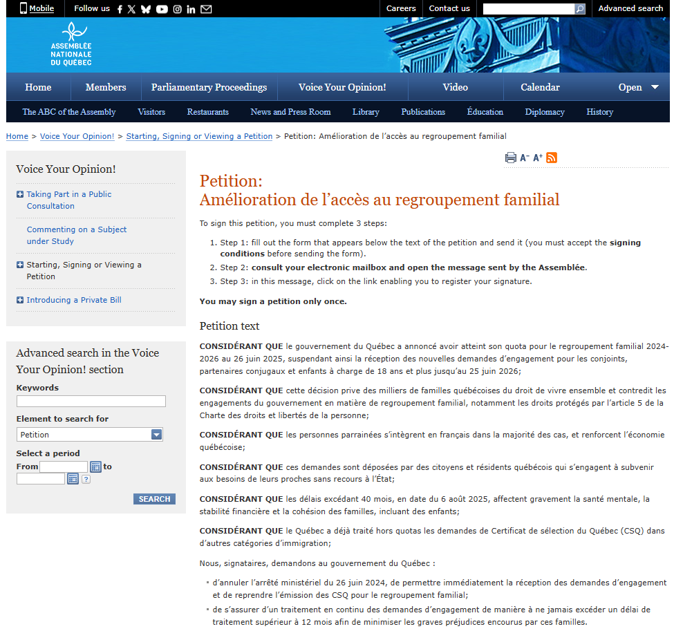 CONSIDERING THAT the Government of Quebec announced on June 26, 2025, that it had reached its quota for family reunification for 2024–2026, thereby suspending the reception of new sponsorship applications for spouses, common-law partners, and dependent children aged 18 and over until June 25, 2026;